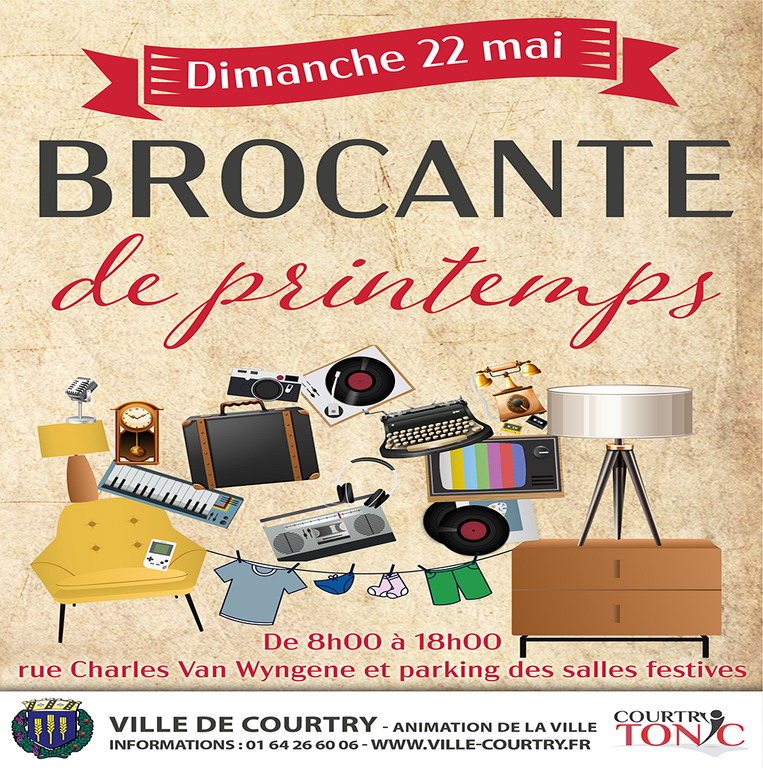 Organisée par l’association Courtry Tonic et la Ville, la brocante de printemps s’étendra rue Charles Van Wyngène, de la ruelle des processions au collège Maria Callas, ainsi que sur le parking des salles festives de 8h à 18h le dimanche 22 mai.