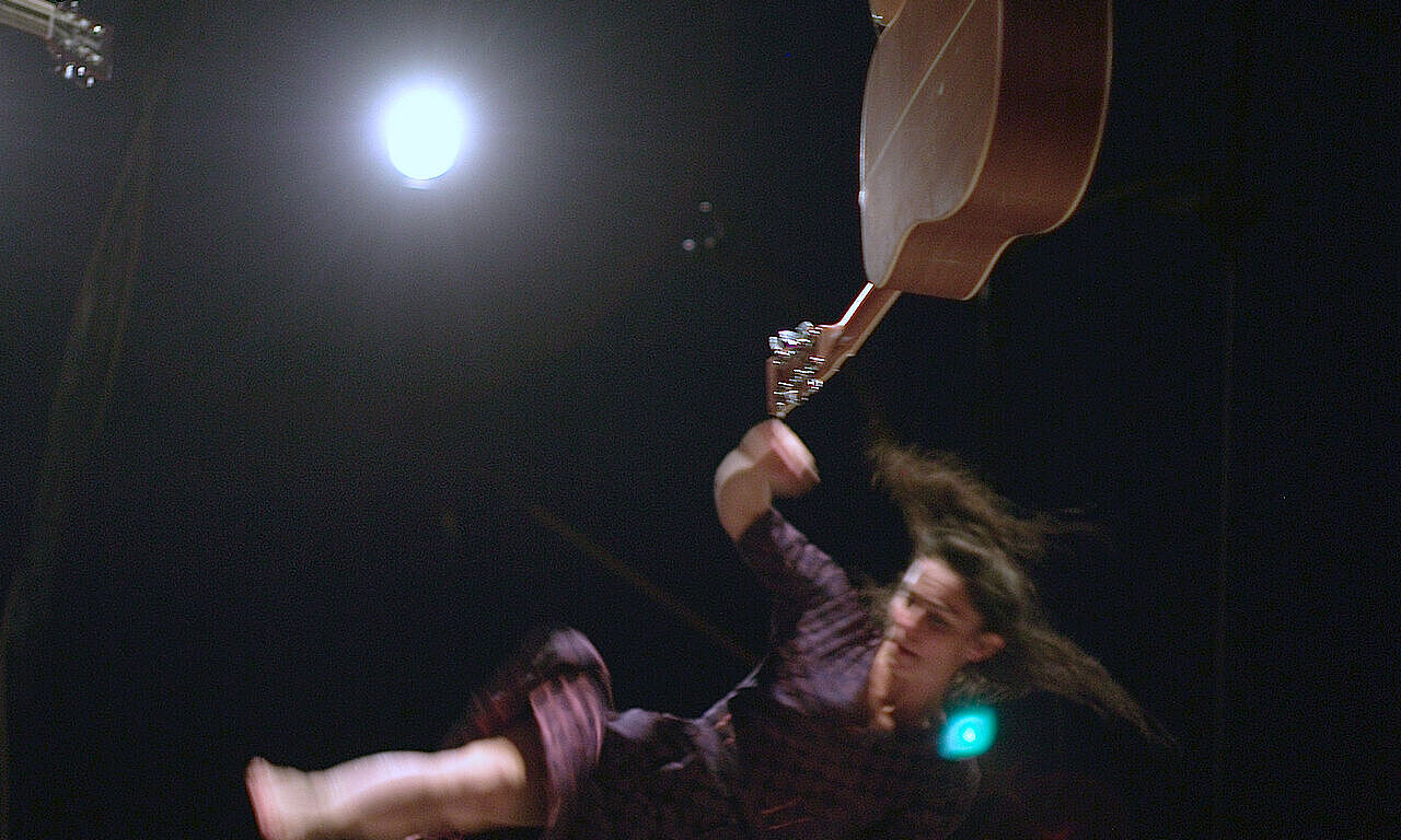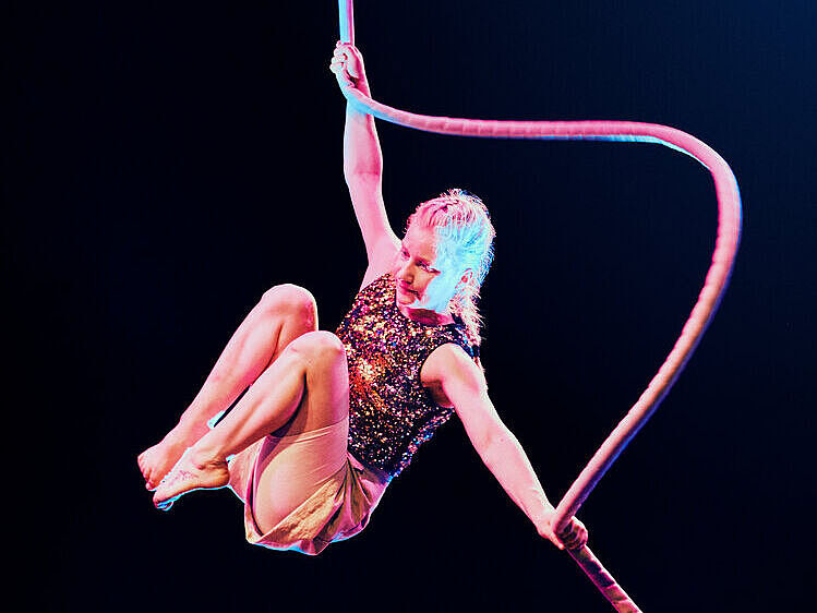 De manière inhabituelle, les artistes affrontent la pesanteur en explorant des pratiques traditionnelles comme la suspension par les cheveux, le main à main, la perche, la corde lisse, mais aussi la roue Cyr ou les patins à roulettes…