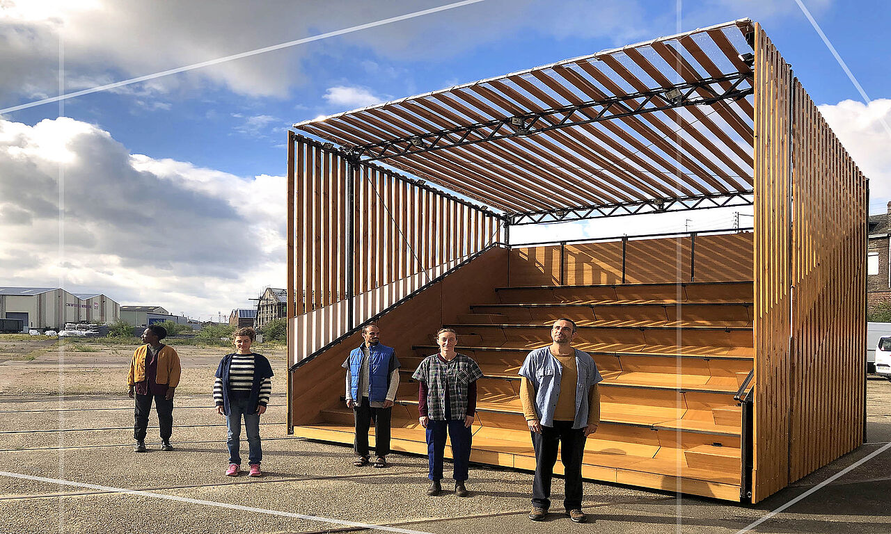 Un gradin posé dans la ville, face à un mur. Tu t’assois dans le gradin pour assister au spectacle.