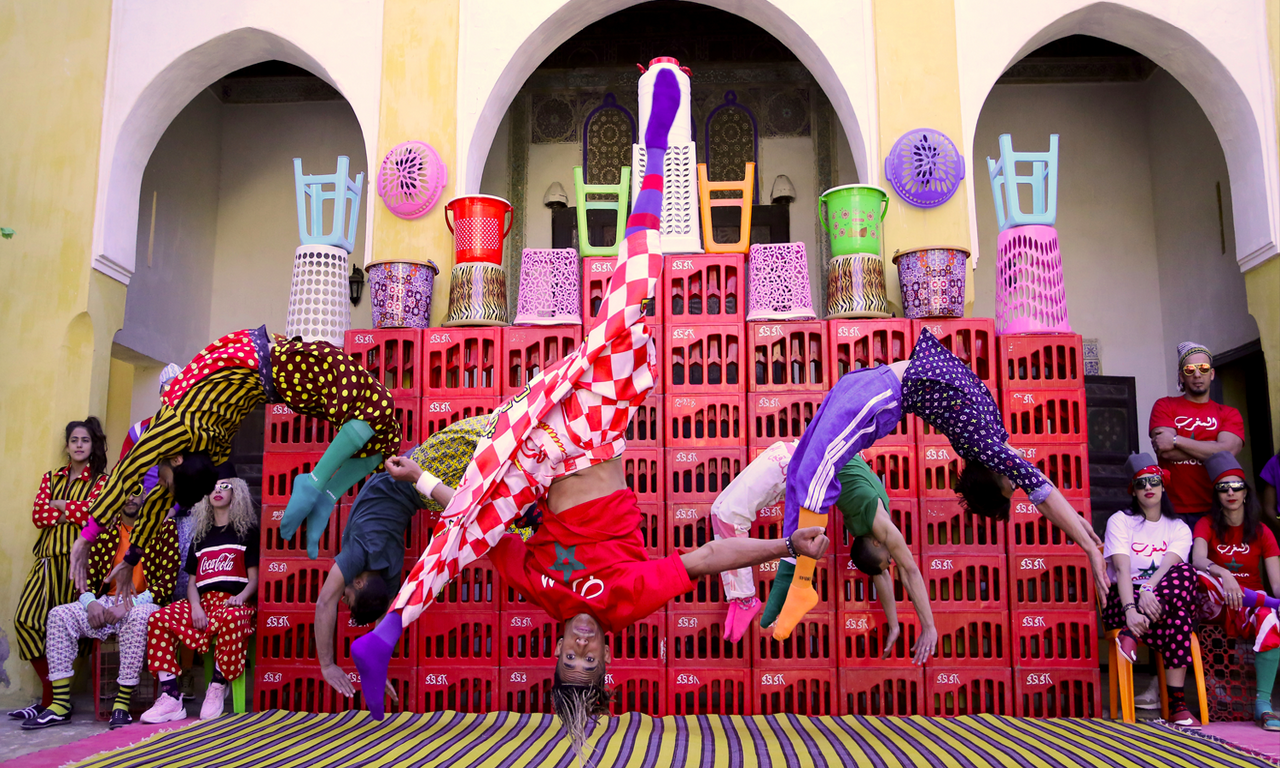 Connue depuis 2004 pour ses époustouflantes pyramides humaines, cette troupe a fait entrer l'acrobatie marocaine traditionnelle dans la modernité en collaborant avec des artistes contemporains de renom. Après Aurélien Bory et le duo Zimmermann et de Perrot, la compagnie rencontre l’humour et l’audace de l’une des figures phares du cirque contemporain, la circographe* Maroussia Diaz Verbèke, et l’univers ultra coloré du photographe et pape du pop art marocain Hassan Hajjaj.