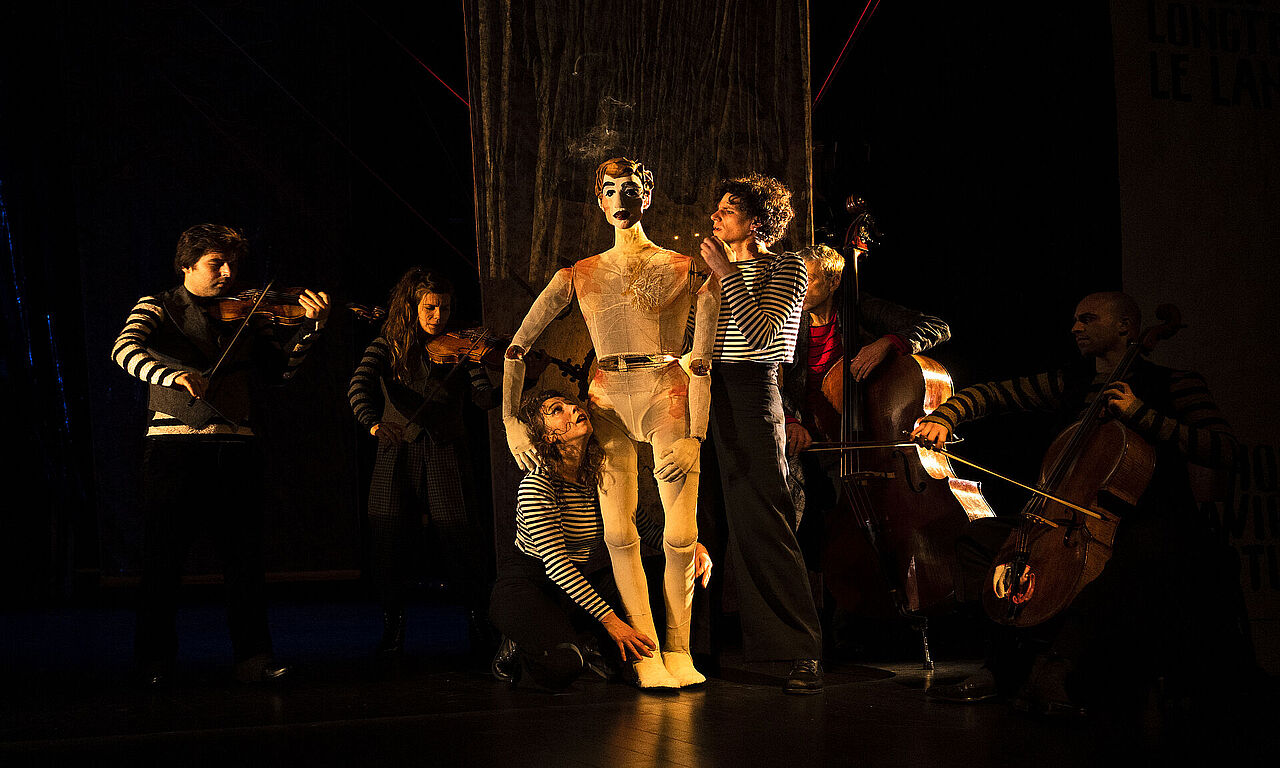 Un quatuor de jeu constitué de deux marionnettistes, d’une plasticienne et d’un homme-échelle et un quatuor à cordes dont la contrebasse est le coeur vibrant.