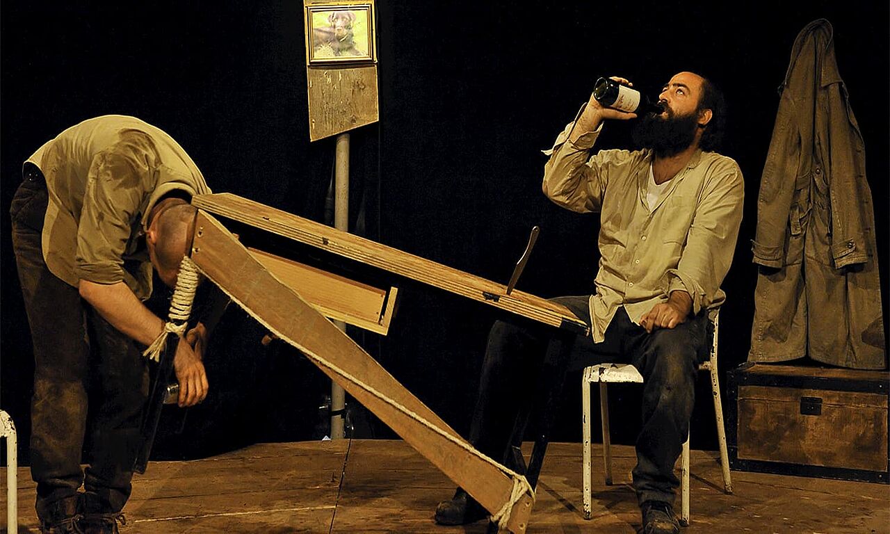 Ces deux comparses, renfrognés et astucieux, jouent avec le danger pour se persuader qu'ils sont bel et bien vivants. Ne craignant ni les taches de vin ni les lancers de couteaux qui dérapent, ils manquent de s’écharper par emballements non contrôlés. À la fois grotesques, émouvants et drôles, les pieds englués dans le présent et la tête dans les étoiles du triomphe passé, ils ne prétendent à rien et sont capables de tout...