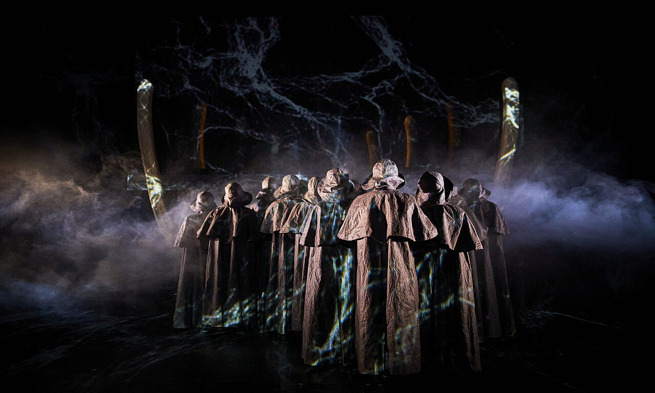 Obsédé par un cachalot légendaire, le capitaine Achab entraîne son équipage dans une quête démente qui les mènera à leur perte. De cette célèbre intrigue d’Herman Melville, Yngvild Aspeli propose une mise en scène à la grandeur du mythe : rien de moins que sept acteurs, une cinquantaine de marionnettes, des projections-vidéos, un orchestre englouti et une baleine grandeur nature. Seul un personnage – Ismaël, narrateur et unique survivant de cette folle chasse à la baleine – est incarné par un comédien « en chair », rejoint par six acteurs, tour à tour chœurs, ombres ou marionnettistes.