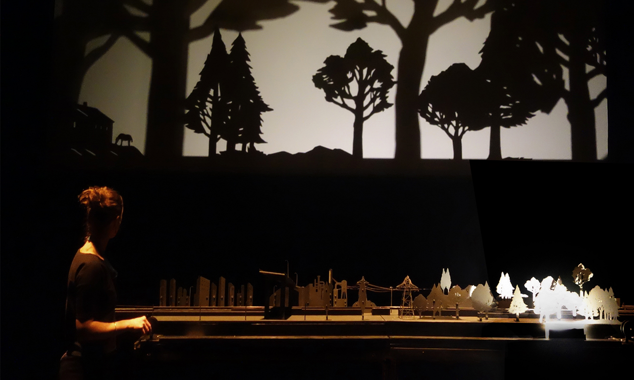 Quatre marionnettistes et deux poly-instrumentistes nous invitent dans les coulisses de leur théâtre d’ombres. À la manière d’un film monté en direct, les personnages et les décors sont manipulés à vue, la musique et les bruitages les accompagnent sur scène : en deux ombres, trois mouvements, les maquettes s’animent, on passe de la piste à la ville, de la rue au chapiteau, on est acrobate, ou prisonnier.