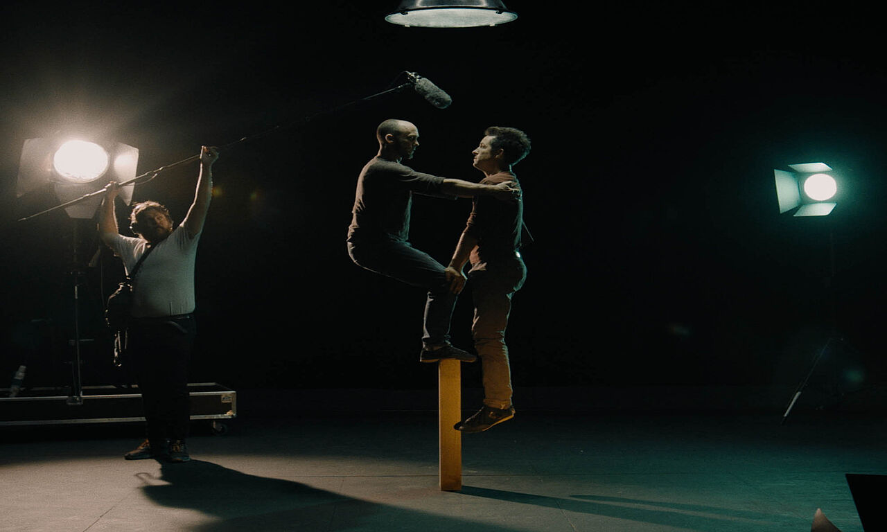 Rapprochons-nous mais pour quoi faire ? Un duo se tient en équilibre sur un bastaing, tandis qu’un perchman capte les sons. En se rapprochant, nous entrons en résonance avec eux, avec ce que nous sommes, notre perception du monde et nos besoins vitaux.
