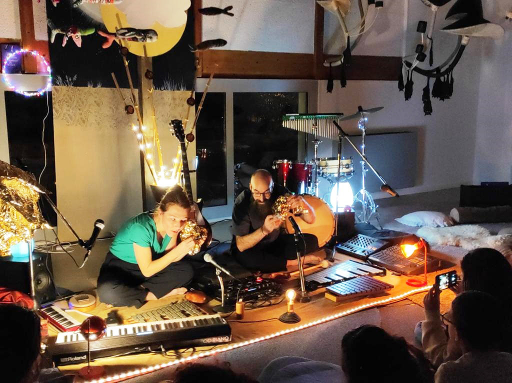 Rêv’à sons est le voyage d’une journée en musique. Deux musiciens et une quinzaine d’instruments nous invitent à vivre un moment poétique du réveil au coucher. Al’entrée du spectacle, les enfants s’installent sur scène, sur des coussins, des tapis, dans une ambiance « comme à la maison ». Les musiciens sont assis au sol, entourés de leurs instruments et d’une atmosphère tamisée.