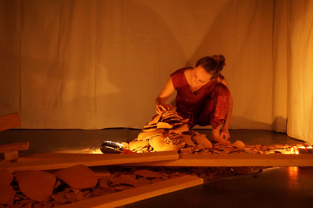 Au milieu de fragments d’argile rouge et de planches de bois, l’interprète et le spectateur se rencontrent dans un parcours initiatique à la recherche d’histoires enfouies.