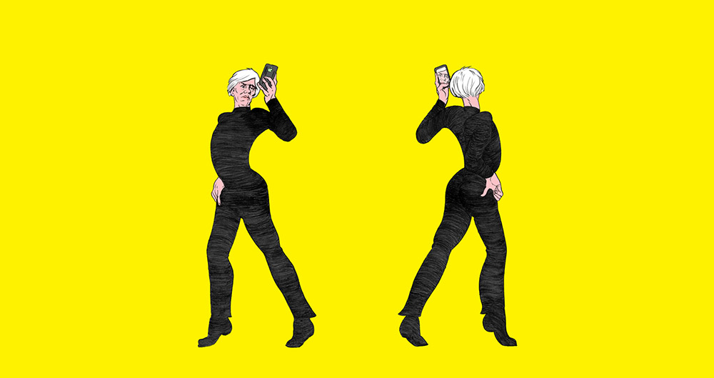 Typex digère dans son dessin le vocabulaire graphique d’Andy Warhol. Il ajuste son trait et ses couleurs pour imiter les différents procédés utilisés par l’artiste, du dessin publicitaire à l’aquarelle, du tampon à la sérigraphie, du photomaton au cinéma.