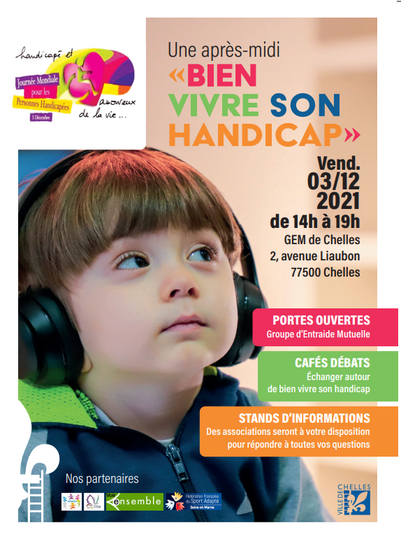 Dans le cadre de la journée mondiale du handicap, la ville de Chelles organise vendredi 3 décembre 2021 au Groupe d'Entraide Mutuelle (GEM) au 2, avenue Liaubon, une après-midi (de 14h00 à 19h00) d'échanges et de partage sur le thème "Bien vivre son handicap".
