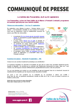 CommuniquésRentrée des Passerelles - Scène de Paris-Vallée de la MarneDu 8 au 24 septembre, Les Passerelles, scène de Paris-Vallée de la Marne à Pontault-Combault, programme un moment spécial pour une rentrée inédite.PDF - 989,2 Ko Télécharger