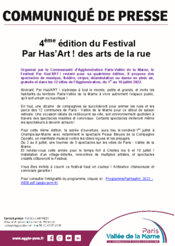 Communiqués4e édition du Festival Par has’Art ! des arts de la rueOrganisé par la Communauté d’Agglomération Paris - Vallée de la Marne, le Festival Par has’ART ! revient pour sa quatrième édition. Il propose des…PDF - 614,9 Ko Télécharger