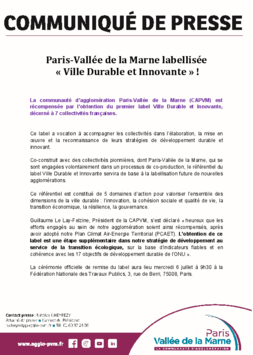 CommuniquésParis - Vallée de la Marne labellisée « Ville Durable et Innovante » !La communauté d’agglomération Paris - Vallée de la Marne (CAPVM) est récompensée par l’obtention du premier label Ville Durable et Innovante, décerné…PDF - 719,5 Ko Télécharger