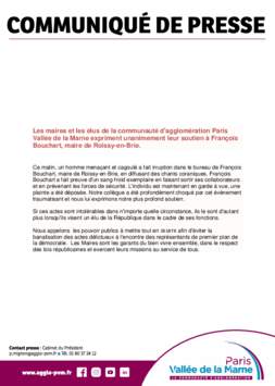 CommuniquésSoutien à François Bouchart, maire de Roissy-en-BrieLes maires et les élus de la communauté d'agglomération Paris - Vallée de la Marne expriment unanimement leur soutien à François Bouchart, maire de…PDF - 210,6 Ko Télécharger