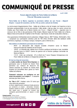 CommuniquésForum objectif emploi de Paris - Vallée de la MarneParis - Vallée de la Marne organise la prochaine édition de son Forum "Objectif Emploi" le jeudi 25 novembre, de 9h à 15h au centre culturel de…PDF - 545,4 Ko Télécharger