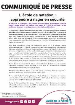 CommuniquésL'école de natation : apprendre à nager en sécuritéÀ partir du 7 septembre, les parents de Paris-Vallée de la Marne pourront inscrire leurs enfants ne sachant pas nager à l’Ecole de natation, où ils…PDF - 991,8 Ko Télécharger