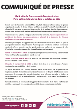CommuniquésMai à vélo : Paris - Vallée de la Marne dans le peloton de têteDans le cadre de l’opération nationale Mai à vélo, Paris-Vallée de la Marne est sur la ligne de départ depuis les villes de Noisiel et…PDF - 916,5 Ko Télécharger