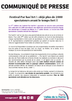 CommuniquésFestival Par has’Art ! : déjà plus de 2000 spectateurs avant le temps fort !!La 4e édition du Festival Par has’Art ! rencontre un succès sans précédent avec déjà plus de 2000 spectateurs aux différents spectacles proposés…PDF - 863,8 Ko Télécharger