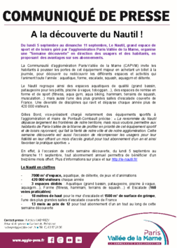 CommuniquésÀ la découverte du Nautil !Du lundi 5 septembre au dimanche 11 septembre, Le Nautil, grand espace de sport et de loisirs géré par l’agglomération Paris -Vallée de la Marne,…PDF - 687,1 Ko Télécharger