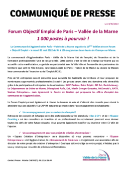 CommuniquésForum Objectif Emploi de Paris – Vallée de la Marne : 1 000 postes à pourvoir !La Communauté d’Agglomération Paris – Vallée de la Marne organise la 10ème édition de son Forum « Objectif Emploi » le mardi 31 mai 2022 de 9h à 15h…PDF - 653,7 Ko Télécharger