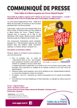 CommuniquésParis-Vallée de la Marne organise son Forum Objectif EmploiParis-Vallée de la Marne organise la 8ème édition de son Forum « Objectif Emploi », le jeudi 7 novembre, de 9h à 15h à la Grande Halle de la Ferme…2 documentsPublié le 04 octobre 2019