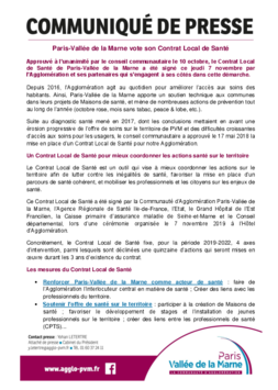 CommuniquésParis-Vallée de la Marne vote son Contrat Local de SantéApprouvé à l’unanimité par le conseil communautaire le 10 octobre, le Contrat Local de Santé de Paris-Vallée de la Marne a été signé ce jeudi 7…2 documentsPublié le 08 novembre 2019