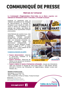 CommuniquésMatinale de l'ArtisanatLa Communauté d’Agglomération Paris-Vallée de la Marne organise une matinale de l’Artisanat le mardi 17 décembre, à Pontault-CombaultPDF - 443,6 Ko Télécharger