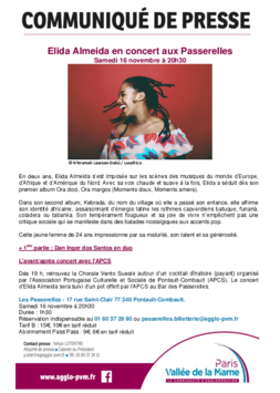 CommuniquésElida Almeida en concert aux PasserellesSamedi 16 novembre à 20h30PDF - 388,3 Ko Télécharger