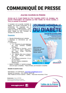 CommuniquésJournée mondiale du diabèteAnimée par le Grand Hôpital de l’Est Francilien (GHEF) de Jossigny, une journée d’information est organisée au Petit Théâtre de l’Arche Guédon, à…2 documentsPublié le 13 novembre 2019