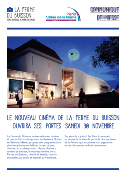 CommuniquésLe nouveau cinéma de la Ferme du Buisson ouvrira ses portes samedi 30 novembreAprès plusieurs années de travaux, le nouveau cinéma de la Ferme du Buisson à Noisiel, rénové et étendu, ouvrira ses portes au public le samedi 30…PDF - 1,4 Mo Télécharger
