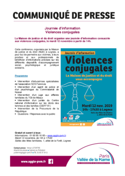 CommuniquésJournée d’information - Violences conjugalesLa Maison de justice et du droit organise une journée d’information consacrée aux violences conjugales, le mardi 12 novembre à partir de 14h2 documentsPublié le 05 novembre 2019