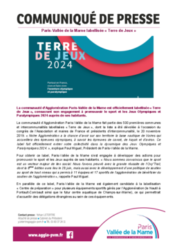 CommuniquésParis-Vallée de la Marne labellisée "Terre de Jeux"La communauté d’Agglomération Paris-Vallée de la Marne est officiellement labellisée « Terre de Jeux », consacrant son engagement à promouvoir le…PDF - 670,9 Ko Télécharger