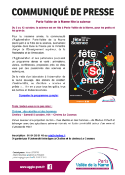 CommuniquésParis-Vallée de la Marne fête la scienceDu 5 au 13 octobre, la science est en fête à Paris-Vallée de la Marne, pour les petits et les grands.2 documentsPublié le 03 octobre 2019