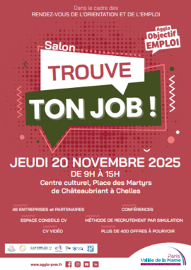Rendez-vous le jeudi 20 novembre 2025, de 9h à 15h, au Centre culturel de Chelles pour une nouvelle édition du salon « Trouve ton Job » !